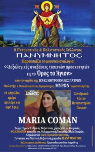Ύμνοι Αναστάσιμοι Δοξολογικοί , ύμνοι αφιερωμένοι στην Παναγία μας και ψαλμοί του Δαυίδ θα αποδοθούν από την εκ Ρουμανίας ψαλμωδό , Μαρία Κόμαν, πλαισιωμένη από τον Ανδρικό Βυζαντινό Χορό που την συνοδεύουν , χαρίζοντάς μας , πράγματι , αγγελικές μελωδίες ….